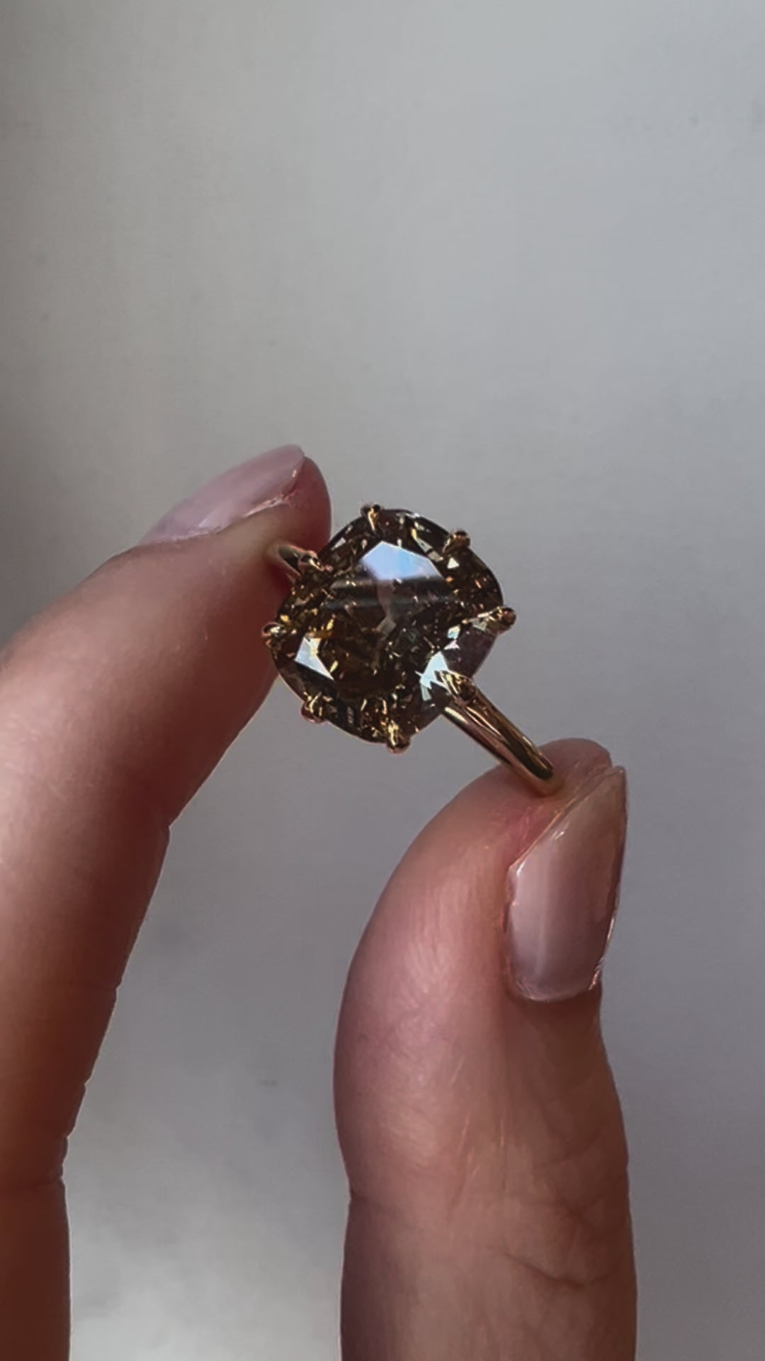 This version of our Norah Ring features a 3.05 carat Fancy Yellow-Brown Cushion Cut diamond set with 8 claw prongs on a tapered, low-profile design.