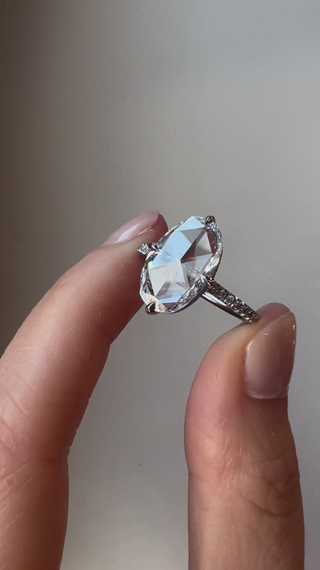 This show-stopping one-of-a-kind ring features a bright white 1.88 carat oval rose cut diamond accented by a delicate half pavé band and hidden halo.